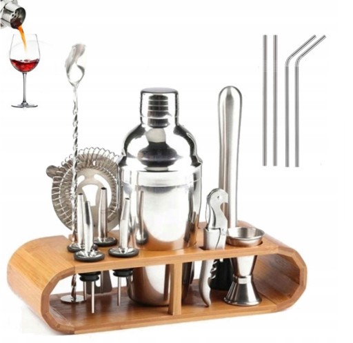 Zestaw do wytrząsania koktajli ma doskonały efekt lustra i wyjątkowy bambusowy stojak, to najlepszy wybór dla osób, które lubią mieszać składniki.