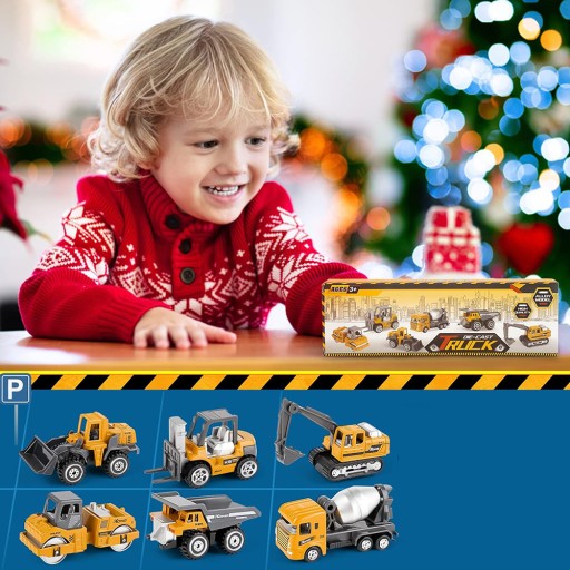 🚗 6-częściowy samochodzik składający się z koparki, hulajnogi, wywrotki, betoniarki, buldożera i wózka widłowego do zabawy i zabawy.