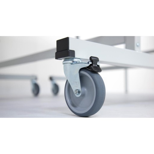 - 4 skrętne koła o średnicy 100 mm z bieżnikiem gumowym na każdym blacie, 2 z blokadą