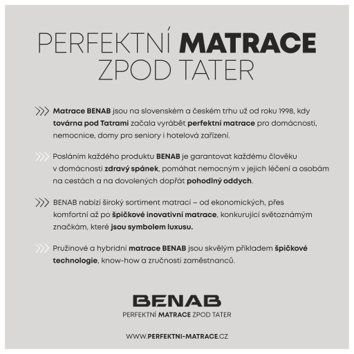 Materace Benab są na rynku słowackim i czeskim od 1998 roku, kiedy zakład pod Tatrami rozpoczął produkcję idealnych materacy dla gospodarstw domowych, szpitali, domów dla seniorów i obiektów hotelowych.