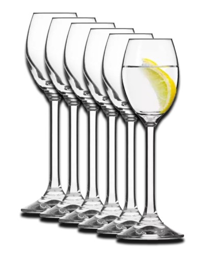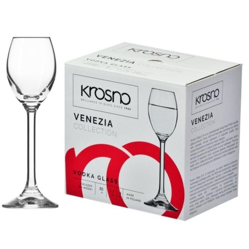 Zestaw 6 kieliszków do wódki o pojemności 50 ml z serii Venezia marki Krosno. Ciekawe kieliszki na długiej nóżce i stabilnej stopce. Wykonane z solidnego szkła Crystalline o wysokiej przejrzystości.