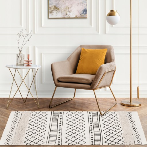 Dywanik w stylu boho to niezwykle uroczy i wyjątkowy element dekoracyjny, który wniesie do Twojego wnętrza niepowtarzalnego charakteru. Wykonany z dbałością o detale, dywan pleciony w kolorze ecru z czarnymi wzorami zachwyca nie tylko swoim wzornictwem, ale także uniwersalnością. Pasuje do różnych pomieszczeń, od salonu, sypialni po przedpokój czy pokój dziecięcy.