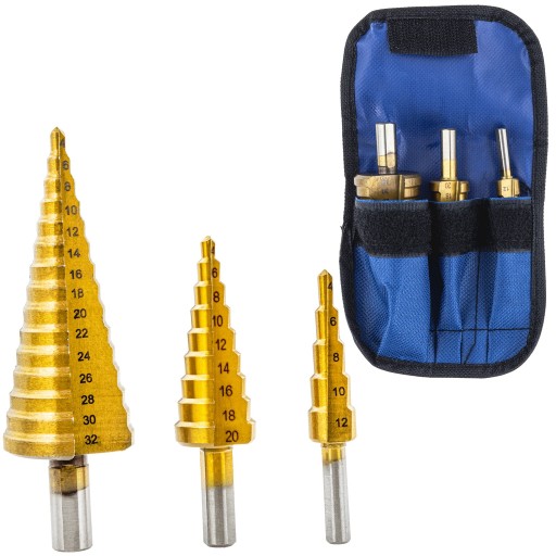 - Zestaw wierteł stopniowych stożkowych, wykonane z wysokogatunkowej stali szybkotnącej HSS + TYTAN. Przeznaczone do metali , blach stalowych cienkościennych, tworzyw sztucznych.