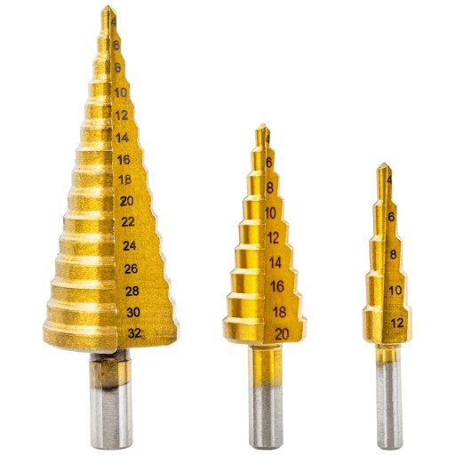WIERTŁA STOŻKOWE STOPNIOWE DO METALU DREWNA PLASTIKU BLACH 4-32 MM