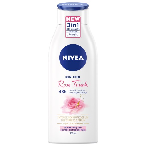 Balsam do ciała Nivea Rose Touch to głęboko nawilżający produkt do codziennej pielęgnacji ciała.Jego skład został wzbogacony o naturalny olejek arganowy, który znany jest ze swoich właściwości nawilżających i odżywczych. Kosmetyk sprawia, że skóra jest aksamitnie miękka i gładka w dotyku. Ponadto utrzymuje odpowiedni poziom nawilżenia nawet do 48h, dzięki czemu doskonale się sprawdzi do suchej skóry. Produkt z łatwością rozprowadza się po skórze, szybko się wchłania, a lekka formuła o zmysłowym różanym zapachu utrzymuje się przez długi czas.