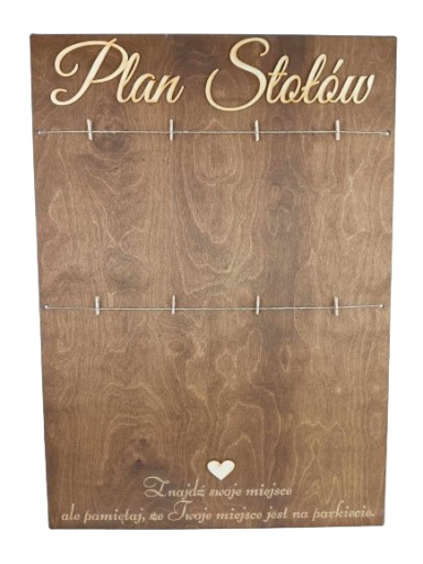 Napis Plan Stołów oraz serduszko są wycięte ze sklejki drewnianej oraz przyklejone do tablicy, natomiast dolny napis jest wygrawerowany.