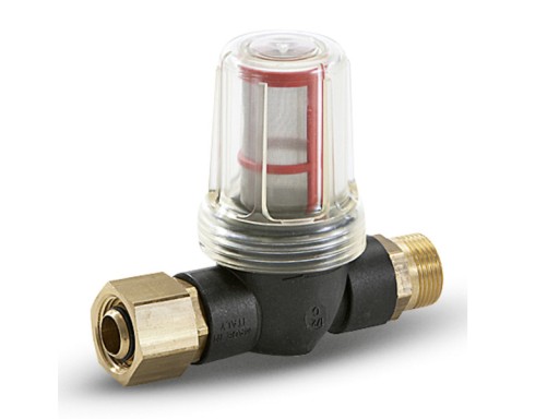 Filtr wody z siatką o drobnych oczkach 100 µm, odpowiedni do temperatur maks. 60°C. Chroni myjkę wysokociśnieniową przed cząstkami zanieczyszczeń zawartymi w wodzie. Z przezroczystą osłoną filtra. Łączy się z myjką wysokociśnieniową lub pływakiem urządzeń HDS (HDS 695 – 1295). Prędkość przepływu wody do 1200 l/h. Złącze 3/4".