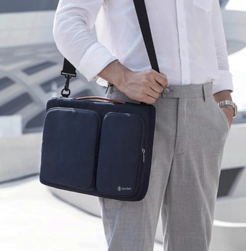 Tomtoc Defender A42 to torba na laptopy o przekątnej 14 i 13.5 cala - posiada jedną dużą komorę dwie bardzo pojemne kieszenie przednie oraz pojemną kieszeń tylną. Otwierana jest tylko wzdłuż jednego krótszego boku, aby zapewnić większą ochronę. Wszystkie krawędzie, ze szczególną dbałością o rogi, wyłożone zostały materiałem absorbującym wstrząsy. Teczka spełnia wojskowy standard MIL STD 810H-516.8 w zakresie upadków.