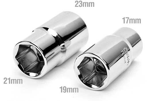 - Wymienne nasadki o rozmiarach 17/19 oraz 21/23 mm pasujące do większości marek pojazdów