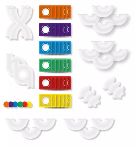 ❤ 20 przezroczystych elementów o różnych kształtach i długościach, które służą do budowania toru kulodromu, a jednocześnie umożliwiają obserwowanie toczących się kulek