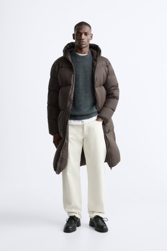 MĘSKI, PUCHOWY PŁASZCZ MARKI ZARA Z LIMITOWANEJ EDYCJI "ORIGINS". WYPEŁNIONY W 80% NATURALNYM PUCHEM, CIEPŁY. KLASYCZNY FASON I BRĄZOWY KOLOR.