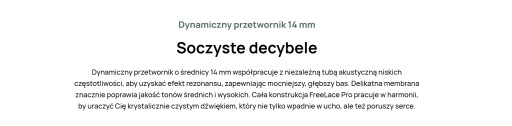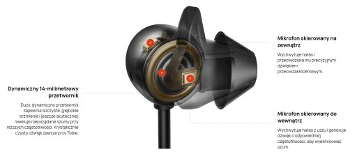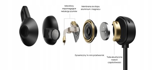 Dynamiczny przetwornik o średnicy 14 mm współpracuje z niezależną tubą akustyczną niskich częstotliwości,