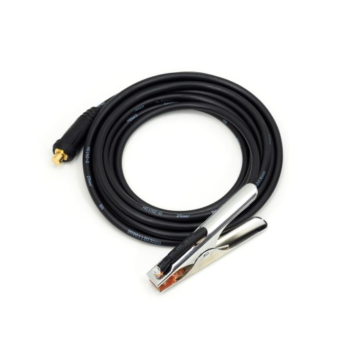 Zestaw miedziowanych przewodów spawalniczych z uchwytem elektrodowym oraz zaciskiem masowym.