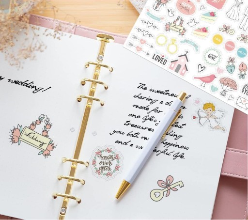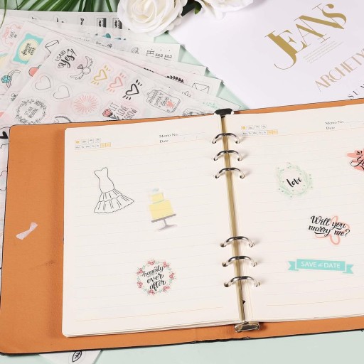 Otrzymasz 9 arkuszy naklejek ślubnych, 8 z nich zawierają 436 naklejek samoprzylepnych wodoodpornych. Możesz dopasować różne wzory, aby stworzyć własne zaproszenie na ślub, album do księgi gości, ramek i wielu innych.