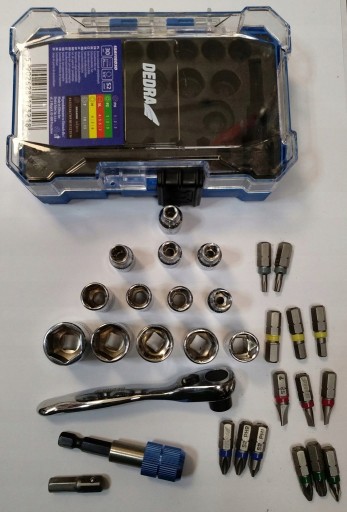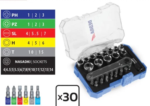 Zestaw 30 szt końcówek wkrętakowych i nasadek. W skład zestawu wchodzą Końcówki PH, PZ, SL, H, T oraz nasadki wraz z grzechotką. Końcówki wykonane zostały ze stali S2, która cechuje się wysoką hartownością oraz odpornością na uderzenia. Dzięki odpowiedniemu składowi chemicznemu i obróbce cieplnej, końcówki na długo zachowują swoje wysokie właściwości wytrzymałościowe. Całość zamknięta w poręczne plastikowe pudełko.
