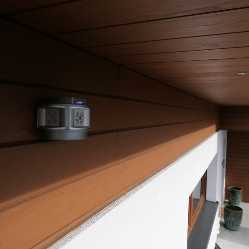 Dodatkowo w zestawie z urządzeniem otrzymujemy metalową blaszkę z otworami, którą za pomocą załączonych wkrętów można przykręcić do dowolnej powierzchni a następnie mocować do niej odstraszacz. Tym sposobem urządzenie możemy przymocować do desek czołowych, filarów drewnianych, drewnianych pergol itp.