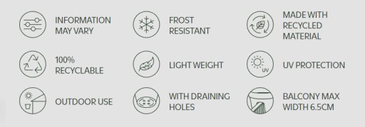 Doniczki na wiele sezonów. Nie zmieniają koloru (odporne na promieniowanie UV), odporne na warunki atmosferyczne - upały i niskie temperatury (mrozoodporne). Uchwyt dodatkowo wzmocniony.