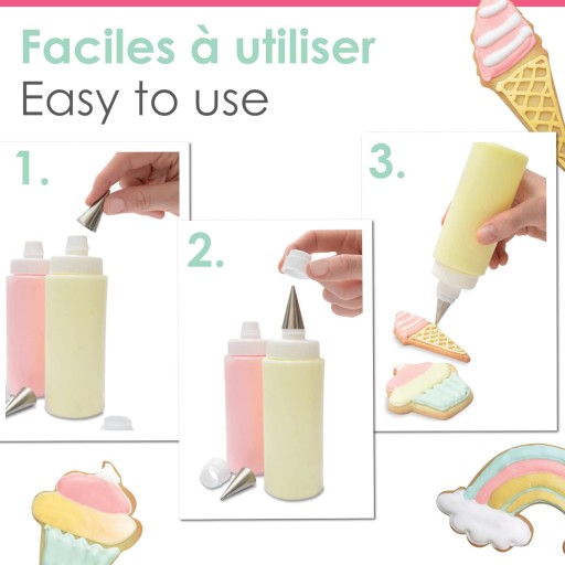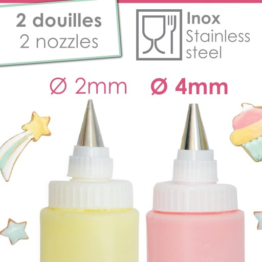 - Łatwy w użyciu - łatwiejszy i wielokrotnego użytku niż kieszeń na gniazda! Butelki są wyposażone w dwa wymienne tuleje ze stali nierdzewnej. Użyj cienkiej tulei Ø 2 mm do glazury kontur ciastka i Ø 4 mm, aby wypełnić ciasteczko. W zestawie znajdują się również zatyczki do zamykania i przechowywania preparatów. Łatwe czyszczenie ciepłą wodą, górna część tych fiolek można odkręcić.