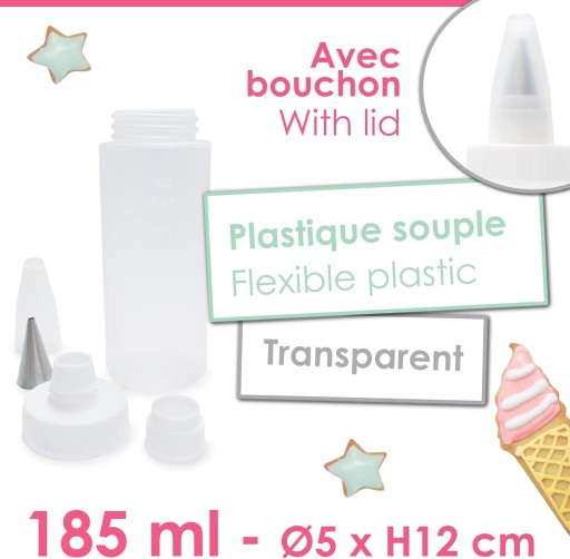 Zestaw 2 butelek do squeezerów + nasadki 185 ml - Do lodów ciast, ciasteczek, piaskowania, deserów - sosów czekoladowych - Elastyczne tworzywo spożywcze - Butelka kuchenna DARMOWA DOSTAWA