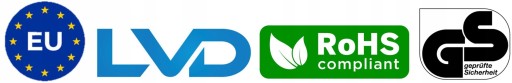 - LVD – bezpieczeństwo elektryczne – chroni użytkownika przed zwarciem, przegrzaniem i innymi zagrożeniami związanymi z codziennym użytkowaniem.