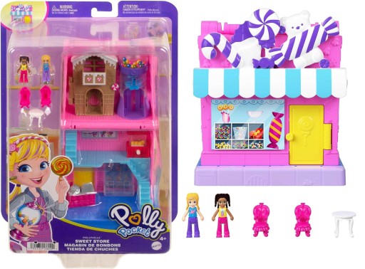 Oddawaj się słodkim marzeniom z tym zestawem Polly Pocket Pollyville Sklepik ze słodyczami z 2 mikrolalkami, 3 akcesoriami i 3 poziomami radosnej zabawy.