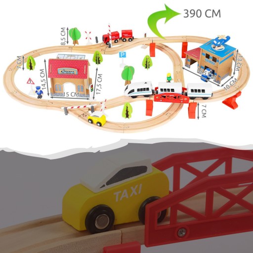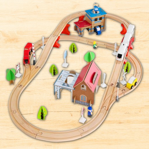 - SPECYFIKACJA – materiał: drewno; zasilanie pociągu: 1x AA (brak w zestawie); ilość elementów w zestawie: 88; szerokość toru: 4cm; wymiary po rozłożeniu: 14,5x90x50cm; waga z opakowaniem: 2,27kg.