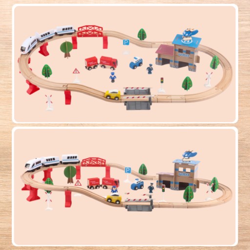 - 88 ELEMENTÓW – zestaw składa się z 89 elementów precyzyjnie wykonanych i ładnie wykończonych, które można układać według własnego pomysłu. W komplecie znajduje się m.in tor, pociąg, 2 samochody, helikopter policyjny z lądowiskiem, ciężarówka z przyczepą, ludziki, stacja kolejowa, budynek policji z miejscem garażowym, most, przejazd kolejowy ze szlabanami, drzewa oraz znaki drogowe. Pociąg oraz ciężarówka z przyczepą łączą się na magnesy, nie posiadają zbędnych haczyków, które mogłyby się odłamać i sprawiać ciągły problem dziecku z rozłączaniem zestawu. Magnesy są mocne – nie puszczają nawet podczas podniesienia całego zestawu do góry.