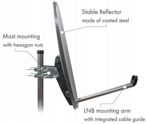 - Zakres dostawy: Antena offsetowa, ramię nośne LNB ze zintegrowanym prowadzeniem kabla, uchwyt masztu z nakrętkami sześciokątnymi