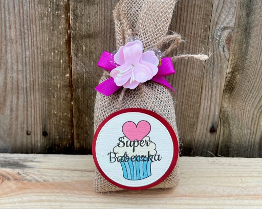 - zestaw 5 herbat w różnych smakach w naturalnym opakowaniu z juty z ozdobą kwiatową i napis Super Babeczka,
