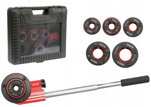 Wysokiej jakości zestaw do gwintowania rur. W skład zestawu wchodzi gwintownica ręczna z systemem grzechotkowym znacznie ułatwiającym pracę oraz przełącznik kierunku pracy. W skład zestawu wchodzi 6 głowic wymiennych o rozmiarach 1/4" (6,3mm), 3/8" (10mm), 1/2" (12,5mm), 3/4" (19mm), 1" (25mm), 5/4" (32mm). Głowice wykonane są z bardzo trwałego i mocnego materiału 9Cr2. Zestaw zapakowany jest w plastikową walizkę wygodną w przenoszeniu oraz przechowywaniu wszystkich elementów.