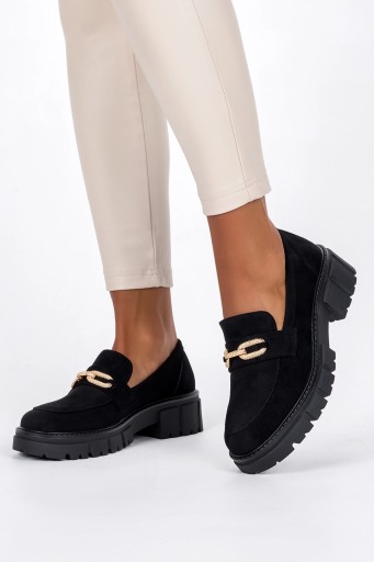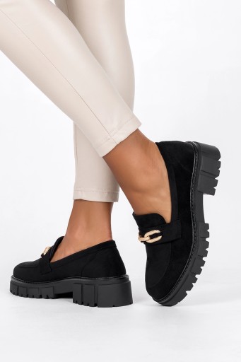 MOKASYNY DAMSKIE PÓŁBUTY LEKKIE NA PLATFORMIE OZDOBNA SPRZĄCZKA CZARNE