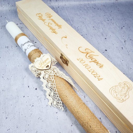 Elegancki i subtelny zestaw świecy i pudełka do Chrztu Świętego. produkt wysokiej klasy Wykonane grawerem laserowym