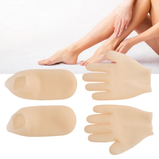 - 1 x para Żelowe rękawice nawilżające do spa (2 szt. na parę) 1 x para silikonowych nakładek na stopy (2 szt. na parę)