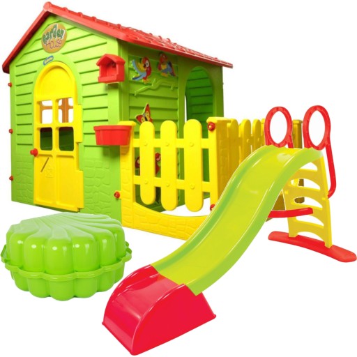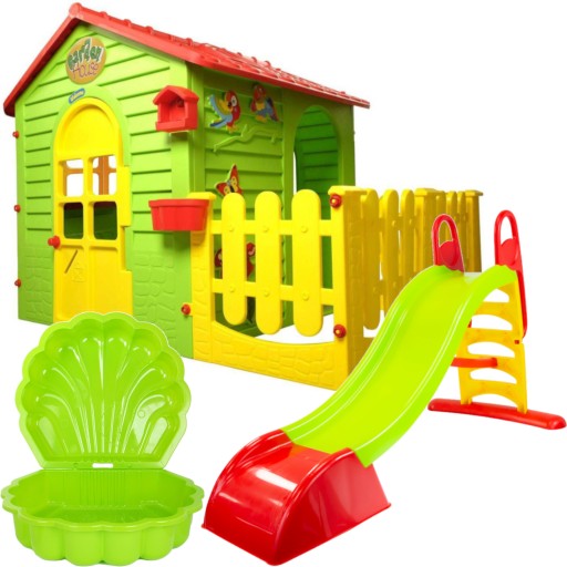 DOMEK OGRODOWY Z PŁOTKIEM ZJEŻDŻALNIA PIASKOWNICA PLAC ZABAW ZESTAW 3W1