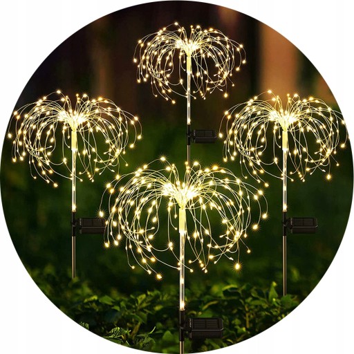 Lampa solarna - diody ułożone są na kształt rozbłyskających fajerwerków. Na cienkim, czarnym grocie ziemnym w połowie wysokości niczym platforma umieszczony jest moduł solarny, który jest wyposażony w akumulator zapewniający, że fajerwerki lśnią w ciemności. Lampa jest sterowana przez czujnik zmierzchu, który włącza ją wieczorem i wyłącza ponownie rano. Kolor biały ciepły światła niezliczonych diod LED stanowi wspaniały akcent świetlny w ogrodzie.