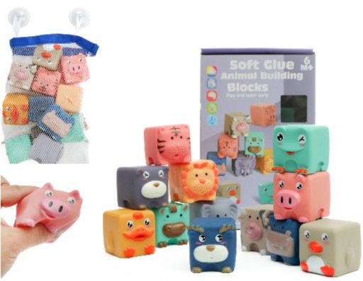 Miękkie klocki Sensoryczne Zwierzątka Dla Dzieci Gryzaki Na Ząbkowanie. Zestaw 12 szt wraz z woreczkiem siatkowym