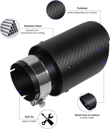 - Wysokiej jakości stal. Konstrukcja z trwałą końcówką wydechową ze stali nierdzewnej SUS304, chroni oryginalną rurę przed słońcem i deszczem, unikaj rdzewienia i deformacji
