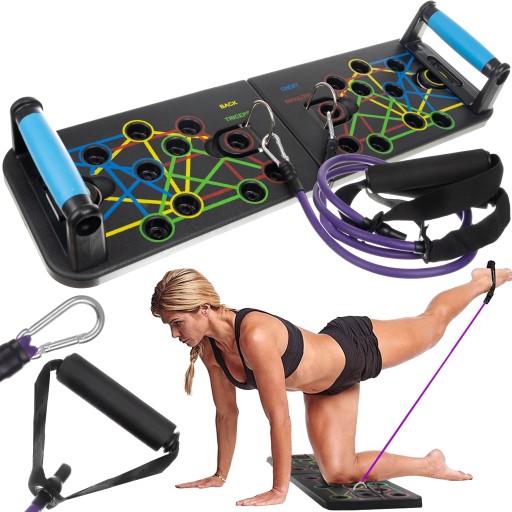 Nasza wielofunkcyjna deska do ćwiczeń z uchwytami do pompek oraz elastycznymi linkami to to idealny przyrząd do domowej siłowni! Dzięki temu przyrządowi oraz swojemu wysiłkowi wyrzeźbisz górne jak i dolne partie ciała.