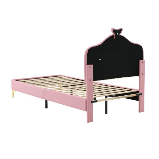 Łóżko tapicerowane, łóżko jednoosobowe, kształt fali z punktem do ciągnięcia u wezgłowia łóżka, różowa kokardka, z wielokolorowymi zmieniającymi się paskami LED, łóżko dziecięce z listwami drewnianymi, łóżko pojedyncze, PU, ​​różowa rama łóżka, 90x200cm