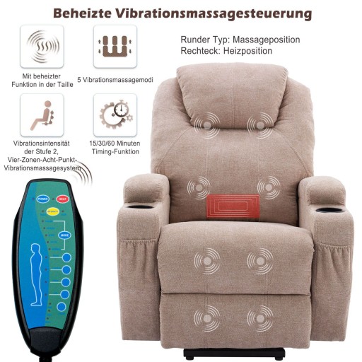 Rozkładany fotel masujący posiada 8 punktów wibracji obejmujących plecy, odcinek lędźwiowy, uda i nogi oraz funkcję ogrzewania odcinka lędźwiowego; Oferuje 5 trybów masażu - Puls, Naciśnij, Fala, Auto, Normalny; Włączaj i wyłączaj masaż wyłącznikiem zasilania.
