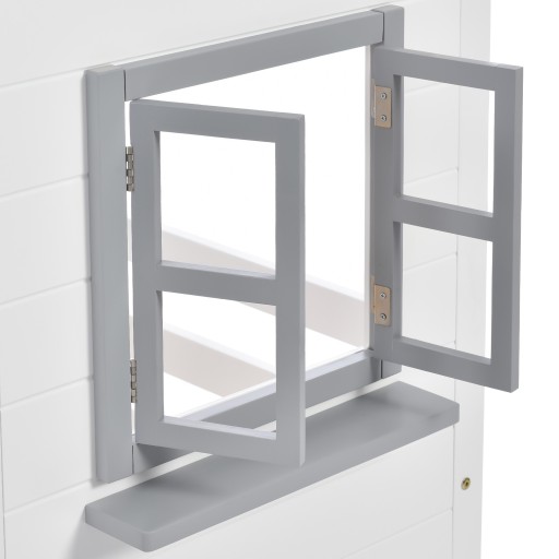 Łóżko piętrowe z poręczą i oknem, łóżko domek, łóżko dziecięce z zabezpieczeniem przed upadkiem i kratą, rama sosnowa, białe (90x200cm)