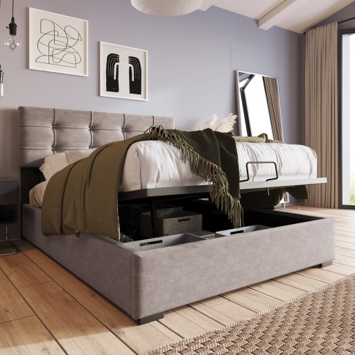 Drążek hydrauliczny — duża przestrzeń do przechowywania. Duża skrzynia łóżka pod składaną ramą z listew z dużą ilością miejsca do przechowywania koców, poduszek lub pościeli. Rama z listew może być łatwo złożona za pomocą siłownika podnoszącego. Wewnątrz znajduje się przestrzeń o wymiarach 82*195 cm.Do spodu łóżka przymocowana jest tkanina Oxford, która chroni przed kurzem.