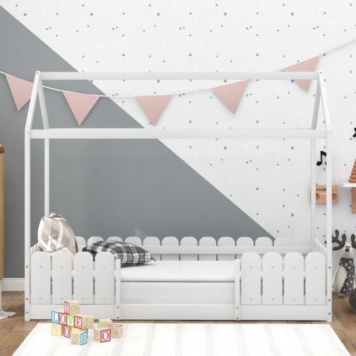 Funkcje ZAPROJEKTOWANE DLA MAŁYCH: Dzięki dachowi i płotkowi to wyjątkowe łóżko tworzy zabawną i uroczą przestrzeń, która służy nie tylko jako wygodne miejsce do spania, ale także miejsce do zabawy i zabawy dla Twoich dzieci. Materiał powierzchni jest łatwy w czyszczeniu, matki nie muszą się martwić, że dzieci rysują rysunki na ramie łóżka.