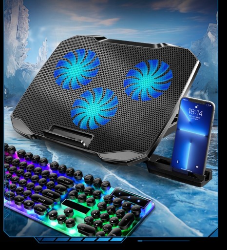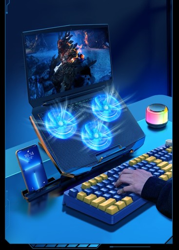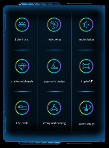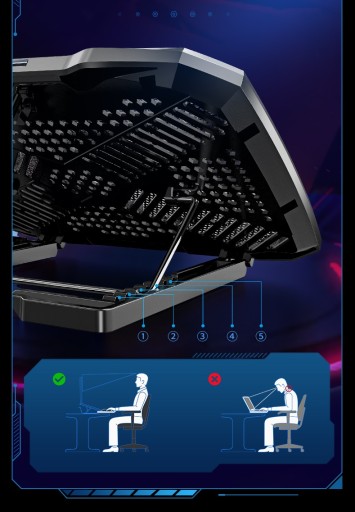 Podstawka pod laptopa to przede wszystkim nowoczesny wygląd, stabilna konstrukcja oraz wydajny system wentylatorów. Rozmieszczenie wentylatorów zapewnia doskonałe i efektywne chłodzenie laptopa bez względu na umiejscowienie nagrzewających się podzespołów notebooka (procesor, karta graficzna, układy zasilania, dyski twarde). Szeroka kompatybilność z laptopami i notebook'ami o różnych wielkościach matryc 12,13,14,15, 16'' Konstrukcja umożliwia korzystanie z podstawki na kolanach. Hydrauliczne łożyska pracują bardzo cicho. Dolna część podstawy posiada dodatkowe nóżki zwiększające kąta nachylenia, tak aby zapewnić jak największą ergonomię pracy.