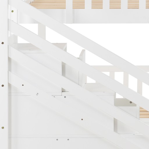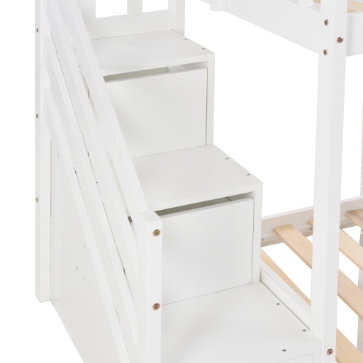 Łóżko piętrowe ze schodkami i zjeżdżalnią, rama z litej sosny, łóżko dziecięce z 2 szufladami w schodach, 90x200cm, białe