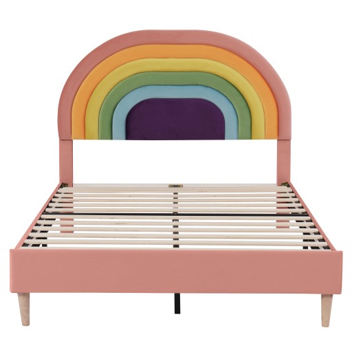 Ponadczasowy design: Łóżko tapicerowane dzięki tapicerowanemu wyglądowi ma klasyczny i jednocześnie nowoczesny design; Łóżko pasuje do większości stylów wnętrz; Łóżko sprawia, że nawet małe pokoje wydają się otwarte i przestronne. Tęczowy zagłówek czyni to łóżko jeszcze bardziej wyjątkowym.