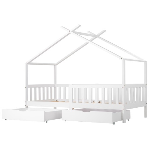 Piękne łóżko domek, łóżko dziecięce, lite drewno z płotem i ramą z listew, pokój dziecięcy i młodzieżowy z zabezpieczeniem przed upadkiem, biały (200x90 cm)