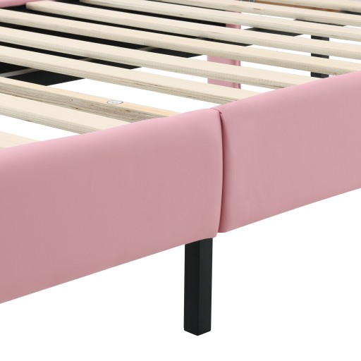 Łóżko tapicerowane, łóżko jednoosobowe, kształt fali z punktem do ciągnięcia u wezgłowia łóżka, różowa kokardka, z wielokolorowymi zmieniającymi się paskami LED, łóżko dziecięce z listwami drewnianymi, łóżko pojedyncze, PU, ​​różowa rama łóżka, 90x200cm
