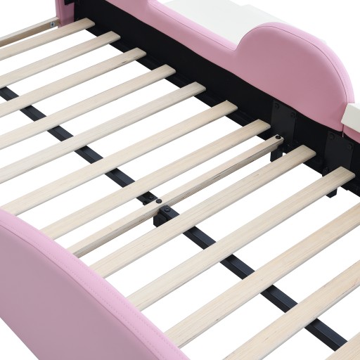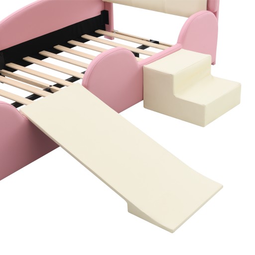 Łóżko Crown Cartoon z wielokolorową, wielomodową taśmą LED, łóżko tapicerowane, łóżko dziecięce z małą zjeżdżalnią i schodami, z miękkimi krawędziami ochronnymi, z drewnianymi listwami, PU, różowy + beżowy, 90x200cm