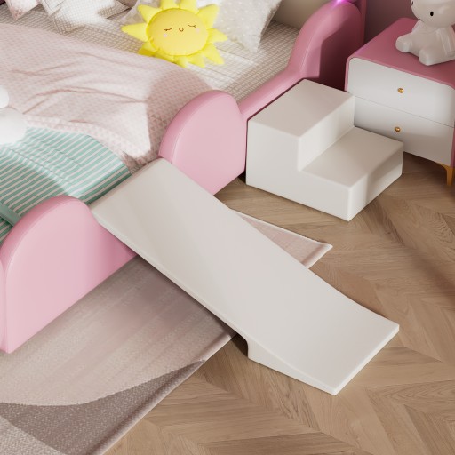 Interaktywne funkcje ze zjeżdżalnią i schodami: dzięki małej zjeżdżalni i schodom tapicerowane łóżko staje się zabawnym i interaktywnym miejscem do zabawy dla Twojego dziecka.